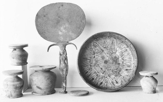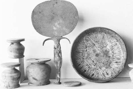 Curiously this evidence does not seem to help with the interpretation of Nilotic scenes in Aegean lands as they are generally dated earlier than their Egyptian counterparts, with some as early as the 19th and 18th Centuries BC. They pre-date the Tell el Dab’a palaces, the volcanic eruption on Thera and Mycenaean shaft graves, as the images in the Theban tombs mentioned above date to the 14th Century BC. This begs the question - what were the really early Nilotic scenes? Numerous examples are to be found; Quartier Mu, Crete, a terracotta Sphinx (1750-1700 BC) with long flowing Aegean locks and a rock crystal bowl (1600 BC) with Minoan grave goods. In December 2019, a new discovery was made at Pylos. Family tombs were found dating from the 15th Century BC containing quantities of flakes of gold from the wall or floor along with a pendant of Hathor, clearly Egyptian in manufacture but found in this Aegean area.
