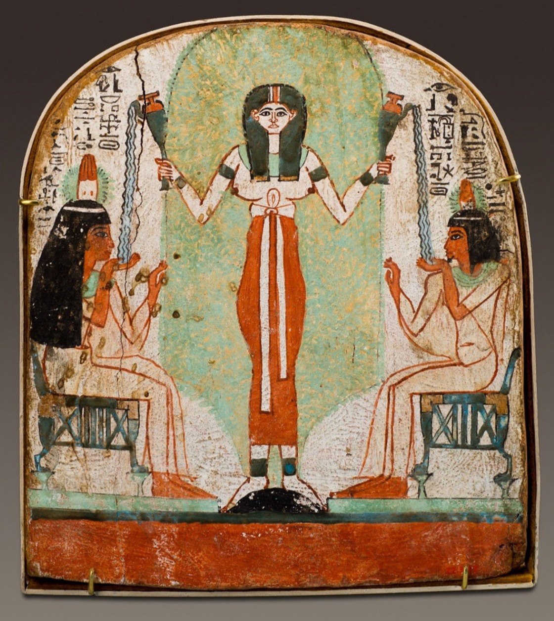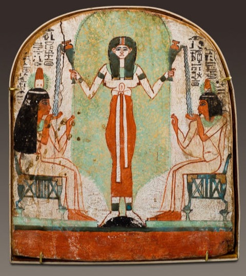 Many goddesses can represent water or breath. Today we understand that as trees add oxygen and remove carbon dioxide from the air they have a practical use in improving air quality. Perhaps the Ancient Egyptians grasped this subconsciously, without having a scientific understanding of the process of photosynthesis. The wood obtained from the native trees, though often of poor quality, was valued, amongst other things, for the construction of coffins, such as the 6th Dynasty coffin of a priestess of Hathor displayed in the British Museum (EA46634 BM). Coffin texts often show the deceased greeting a goddess in her tree form. Many tomb paintings show scenes of sycamore fruits and wood being harvested.