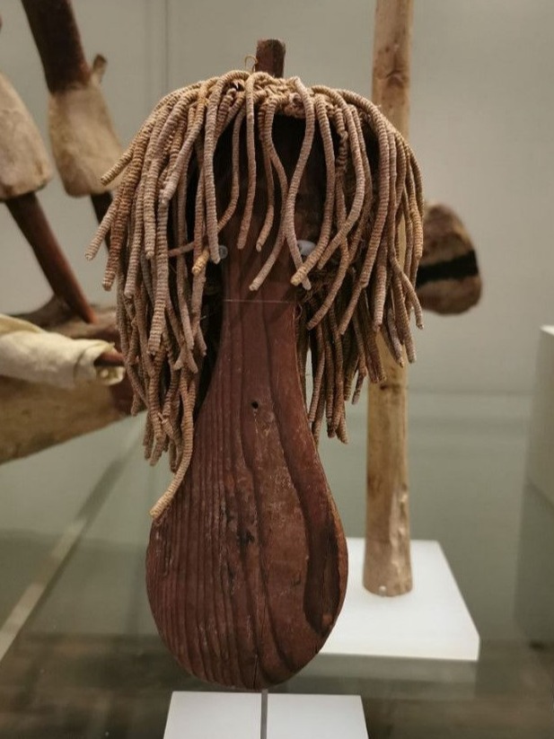 Locally, some can be found in the Atkinson Museum in Southport, and in both the Liverpool and Manchester collections. The Atkinson examples show differences in construction and preservation. One shows evidence of considerable damage. The length of the arms and legs suggest it is truncated and the base is squared off, with most of it missing. Most of the hairpiece is also lost. Another is covered with a white residue and again damaged at the base with little hair. The third has a hairpiece that seems to have been bulked out with straw, possibly added later to make it more saleable as, on close inspection, it looks like two pieces joined together. The grain of the wood can be clearly seen on the paddle doll in Liverpool’s World Museum and there is very little decoration. It is shorter and wider at the base than most examples and the very full hairpiece is quite different, being made of coiled linen strands on a linen base, rather than mud beads. The Manchester doll is more like the Atkinson dolls and is quite plain in design with some pigment decoration.