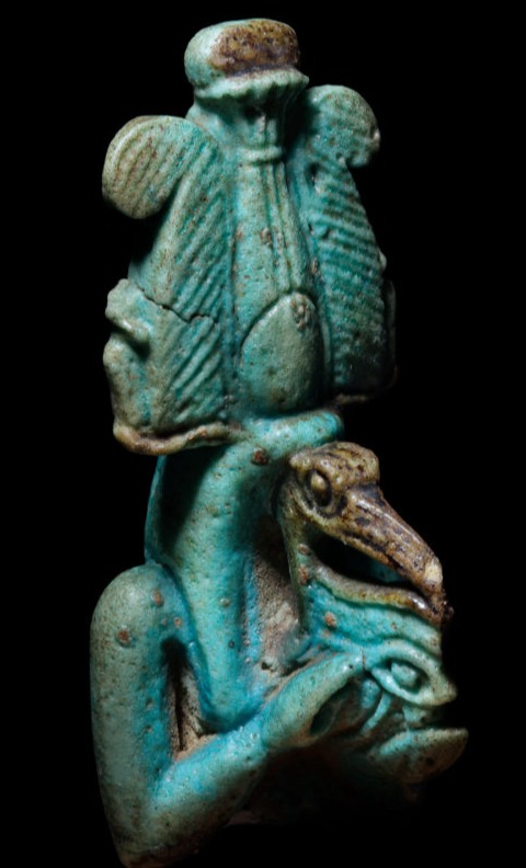In the sky falcons were the most commonly known and depicted birds with many deities connected to them, starting with the hawk deity at predynastic Hierakonpolis. Another prominent bird in the iconography is the ibis, associated with Thoth, and vast numbers of mummified ibises used as votive offerings have been uncovered. Again in the imagery some of the birds are easily identifiable, but this is not always the case, especially in some of the earliest examples.