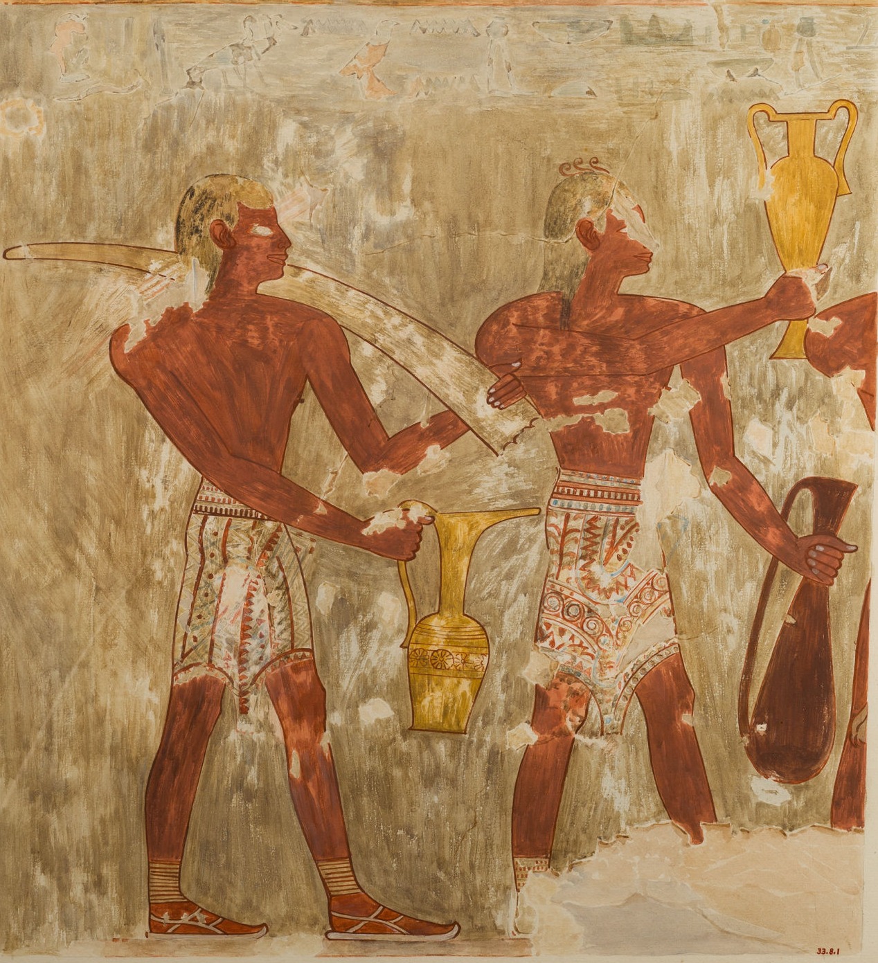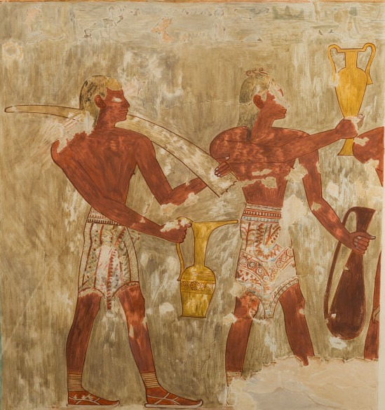 Aegean people featured in some Egyptian tombs, with a number of tombs belonging to 18th Dynasty nobles from the reigns of Hatshepsut, Thutmosis III and Amenhotep III showing people referred to as ‘men of Keftiu‘, the Egyptian name for Crete, and more are depicted on a statue base at Kom el Hettan.
